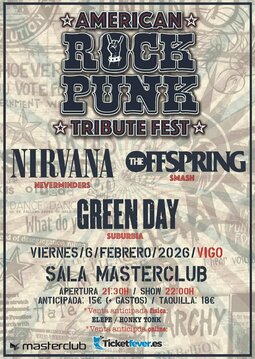 “American Rock Punk” es un festival donde podrás revivir las canciones de las grandes bandas del punk-rock americano, de la mano de sus mejores bandas tributo: NIRVANA (Neverminders), GREEN DAY (Suburbia) y THE OFFSPRING (Smash).