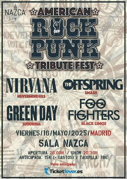 “American Rock Punk” regresa en su nueva temporada con el festival de tributos más rompedor, que ya ha petado las mejores salas de todo el país reviviendo los temazos de las grandes bandas del punk-rock americano, de la mano de sus mejores bandas tributo: NIRVANA (Neverminders), GREEN DAY (Suburbia), THE OFFSPRING (Smash) y FOO FIGHTERS (Black Limos).
