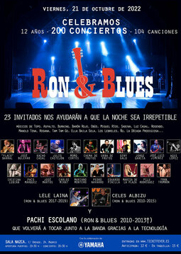 12 años, 104 canciones, ¡200 CONCIERTOS! RON & BLUES es probablemente la banda de versiones en activo más veterana de la escena madrileña, y celebra su concierto 200 nada menos que con ¡23 músicos invitados!