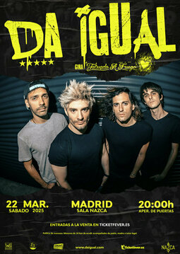 La banda de Pop Punk, muy reconocida por sus versiones de canciones folclóricas llevadas a su estilo, vuelve a Madrid para presentar su nuevo trabajo de estudio. Su directo y la diversión ’a full’ durante dos horas que se hacen cortas, ya es un secreto a voces. No te pierdas a Da Igual en concierto.